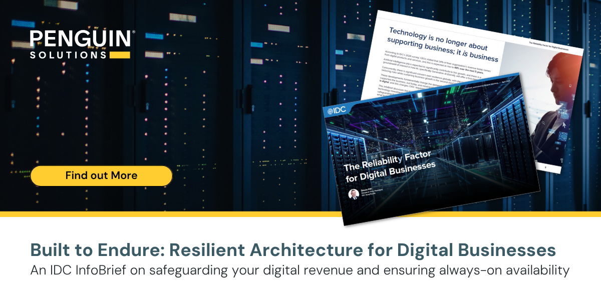 This IDC report, developed with Penguin Solutions, examines how leading enterprises are transforming their infrastructure strategies to address three critical challenges: protecting digital revenue streams against outages, scaling for AI-driven demands, and maintaining control in increasingly complex hybrid environments. The findings reveal why 46% of CEOs now prioritize cyber resilience investments and how infrastructure decisions are making the difference between market leaders and laggards in the digital economy.